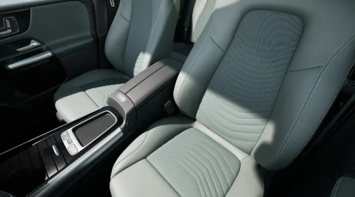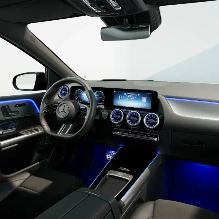 La nuova Classe B è disponibile in una vasta gamma di colori e materiali per gli interni, consentendo un alto livello di personalizzazione. Nella variante di base, i sedili sono stati migliorati ulteriormente con un rivestimento ARTICO in rilievo tridimensionale, garantendo un comfort ergonomico ottimale. La versione “Progressive” offre l’esclusività tipica di Mercedes con una scelta di colori tra nero, nero/macchiato e il nuovo nero/grigio salvia e sedili in pelle nera o marrone bahia. Un elemento distintivo nell’abitacolo è il nuovo elemento di rifinitura con motivo a stella. Per la versione AMG Line interni in nero ARTICO/MICROCUT e impunture rosse a contrasto.